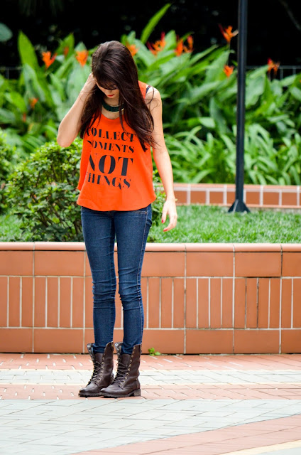 Eu Usei: Regata Laranja (HandBook), Jeans (Damyller), Coturno Marrom (Cravo e Canela), Maxi Colar Verde (Bijoux by Geo), Batom Vermelho (Ruby Woo – MAC).