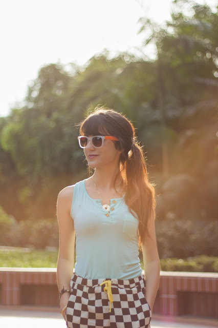 O dia estava super gostoso e o clima agradável, por isso optei pelo combo short quadriculado soltinho + regata candy color! Achei o resultado final colorido, divertido e mega confortável =)