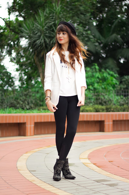 Eu Usei: Blazer Branco (Romwe AQUI), T-shirt (Coisas de Thalitha AQUI), Legging (Zara), Bota (Via Marte), Chapéu (Ebay AQUI), Colar (Bijoux by Geo AQUI).