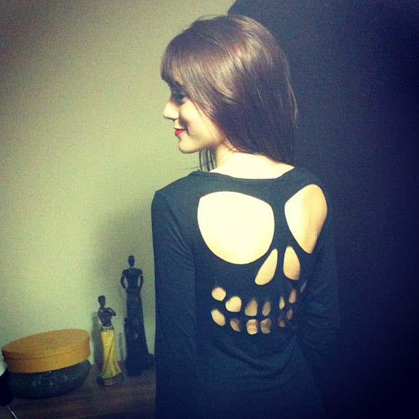 Look da noite com detalhe de corte de caveira nas costas (clique aqui).