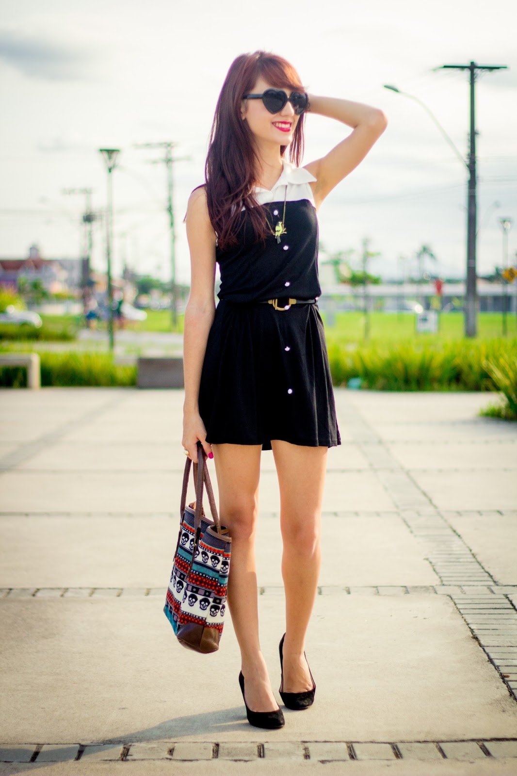 Eu Usei: Vestido preto e branco (Loja Lado B CLIQUE AQUI), Óculos de coração preto (Loja Lado B CLIQUE AQUI), Colar de pássaro (Loja Lado B CLIQUE AQUI), Sapato Preto (Renner), Bolsa Caveiras (Loja Lado B CLIQUE AQUI).