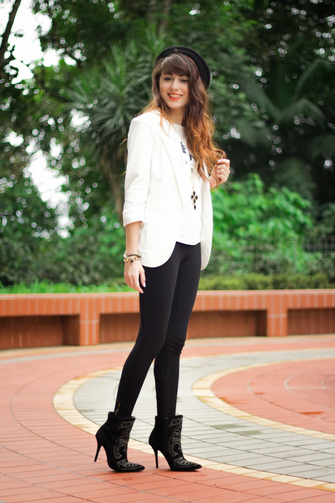 Eu Usei: Blazer Branco (Romwe AQUI), T-shirt (Coisas de Thalitha AQUI), Legging (Zara), Bota (Via Marte), Chapéu (Ebay AQUI), Colar (Bijoux by Geo AQUI).