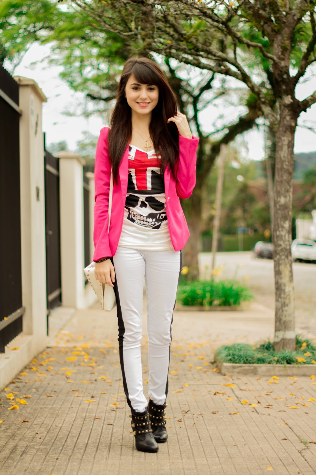 Eu Usei: Calça branca/listra preta (Blue Steel – Renner), T-shirt caveira (Loja Lado B clique aqui), Blazer Pink (Romwe clique aqui), Bolsa branca (Comprei numa loja de SP), Colar crucifixo (By Geo clique aqui).