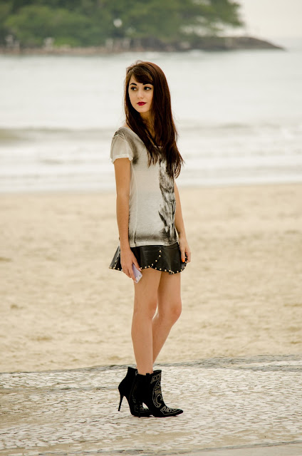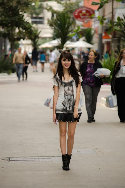 Eu Usei: Camiseta Lobo (Blue Steel – Renner), Saia Couro Sintético (Loja Coisas de Thalitha clique aqui), Bota Via Marte).