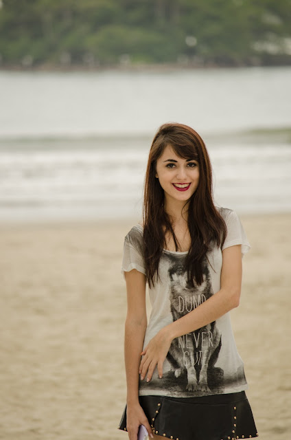 Adoro usar saias e vestidos, por isso estou aproveitando esses últimos dias antes do inverno rigoroso chegar para deixar as pernocas de fora! Optei pela t-shirt básica para deixar o look mais casual!