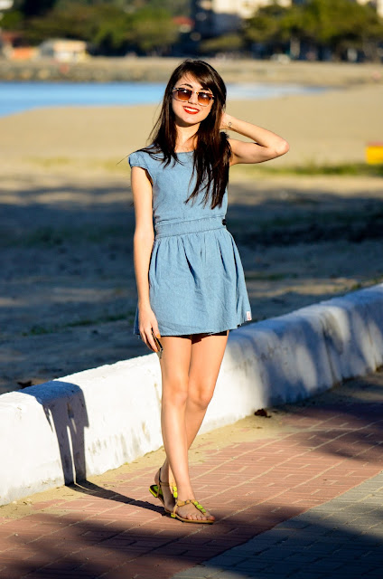 Oi amores, tudo bom? Depois de 3 dias de chuva consecutiva em Joinville, um sol lindo resolver fazer o favor de bater na minha janela pela manhã para me dar bom dia. Resolvi tirar meu vestido jeans do armário para estrear na praia, porque o dia pedia algo leve e confortável. As fotos foram tiradas no calçadão  de Piçarras/SC (uns 40 minutos de Joinville). Vamos conferir?