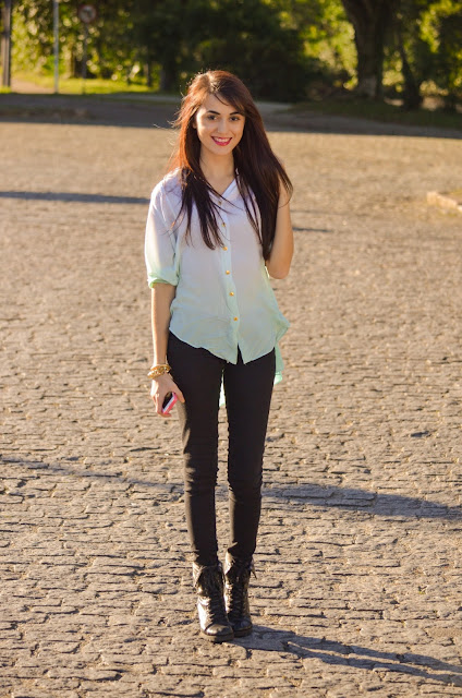 Oi amores, tudo bom? Como foi o feriado de vocês? Eu aproveitei o dia lindo que fez hoje em Joinville para fotografar o meu look casual e confortável. Usei uma das minhas botinhas/coturno favoritas do inverno e uma camisa mais soltinha com gradientes em branco e verde menta. Vamos conferir?