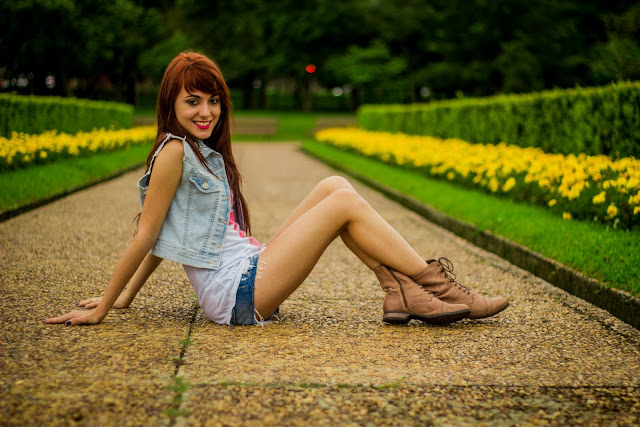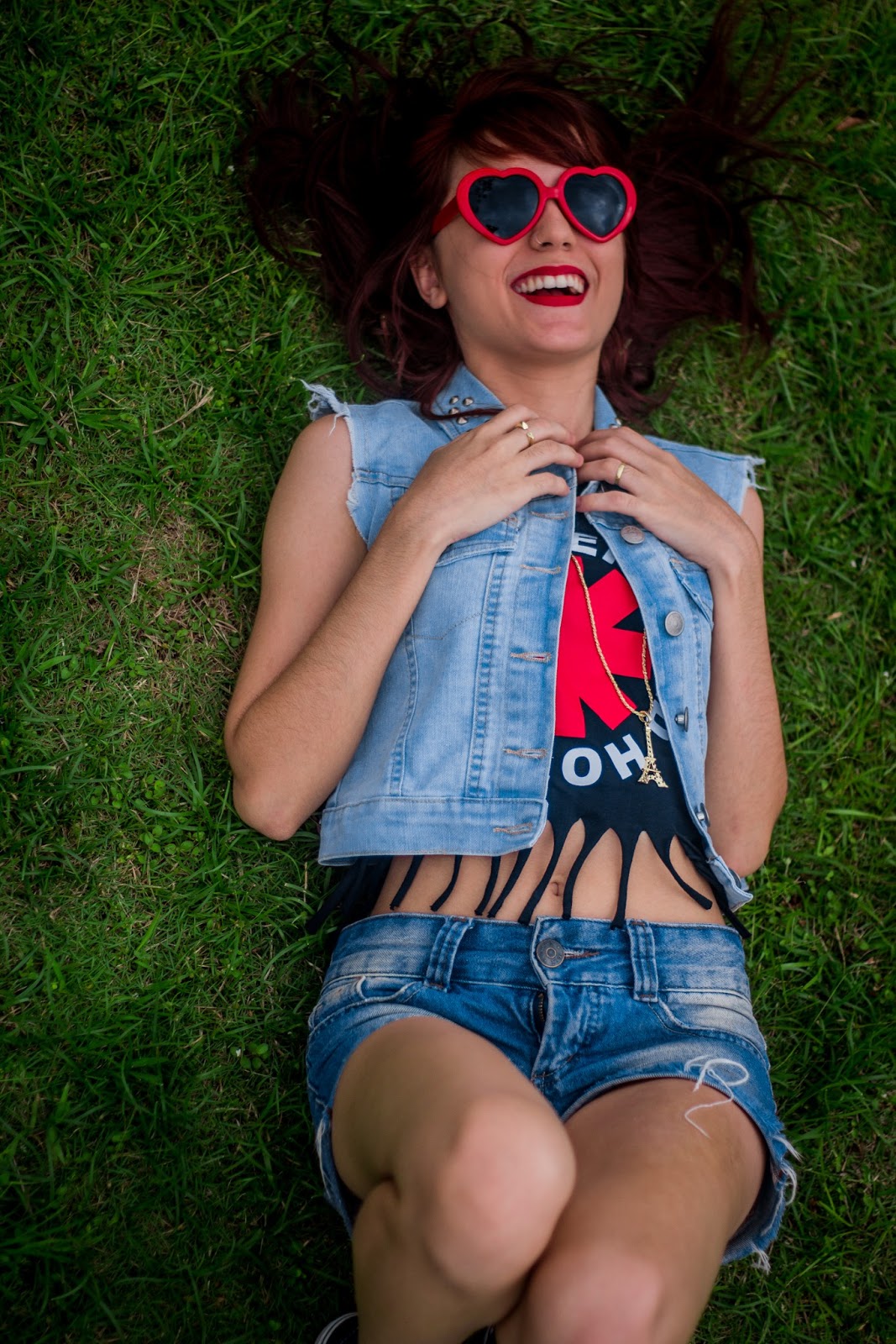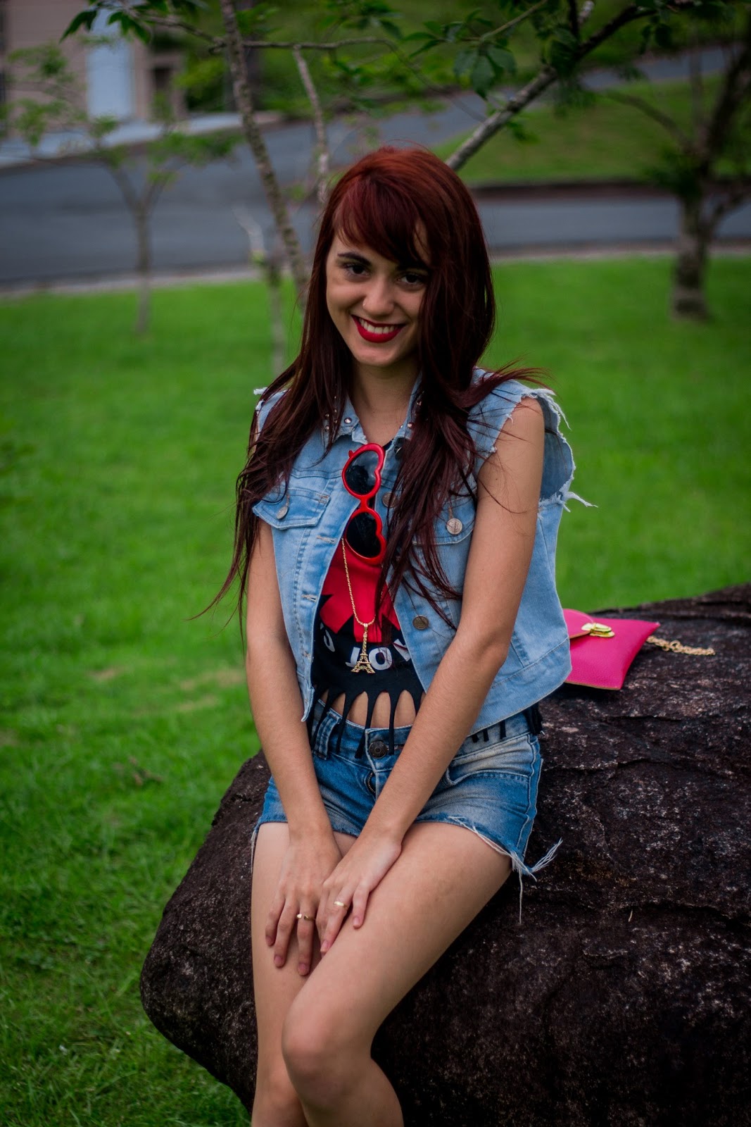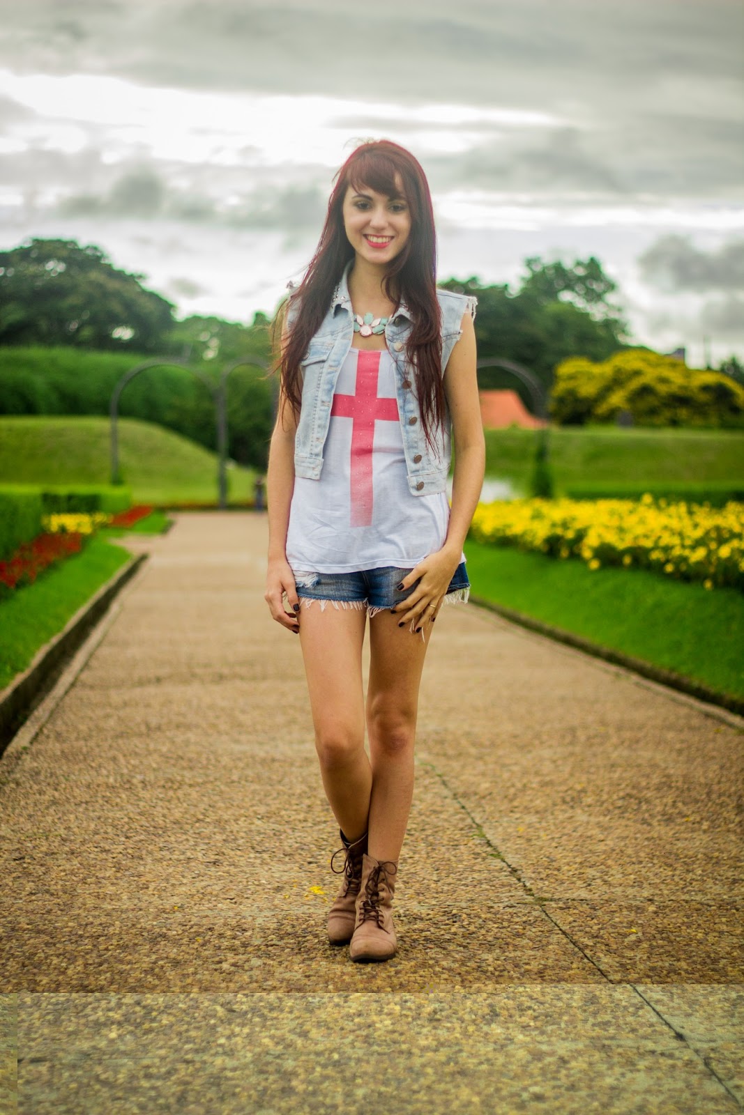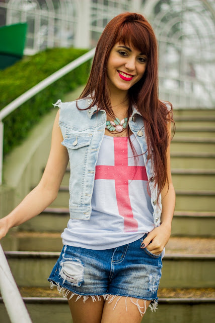 Eu usei: Regata branca de crucifixo rosa (Renner, coleção de verão), Colete Jeans com tachas (Renner, coleção nova), Short Jeans Boyfriend (Loja Moça Bonita – Joinville), Botinha marrom (Bottero), Maxicolar Candy Color (Ludora Boutique), Esmalte Jabuticaba (Abelha Rainha), Batom Lip Cream (Addis Ababa – NYX).