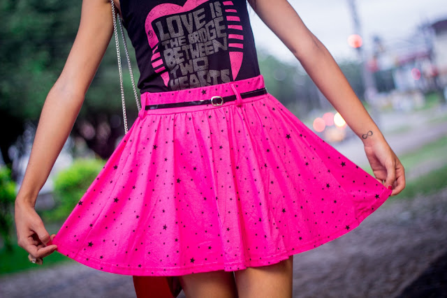 Eu usei: Regatinha preta (Marisa), Saia pink de estrelas (Marisa e o cinto vem junto!), Acessórios (roubei da mamis), slipper turquesa de spikes (olook), bolsa vermelha (Renner por R$19,90 acreditem!).
